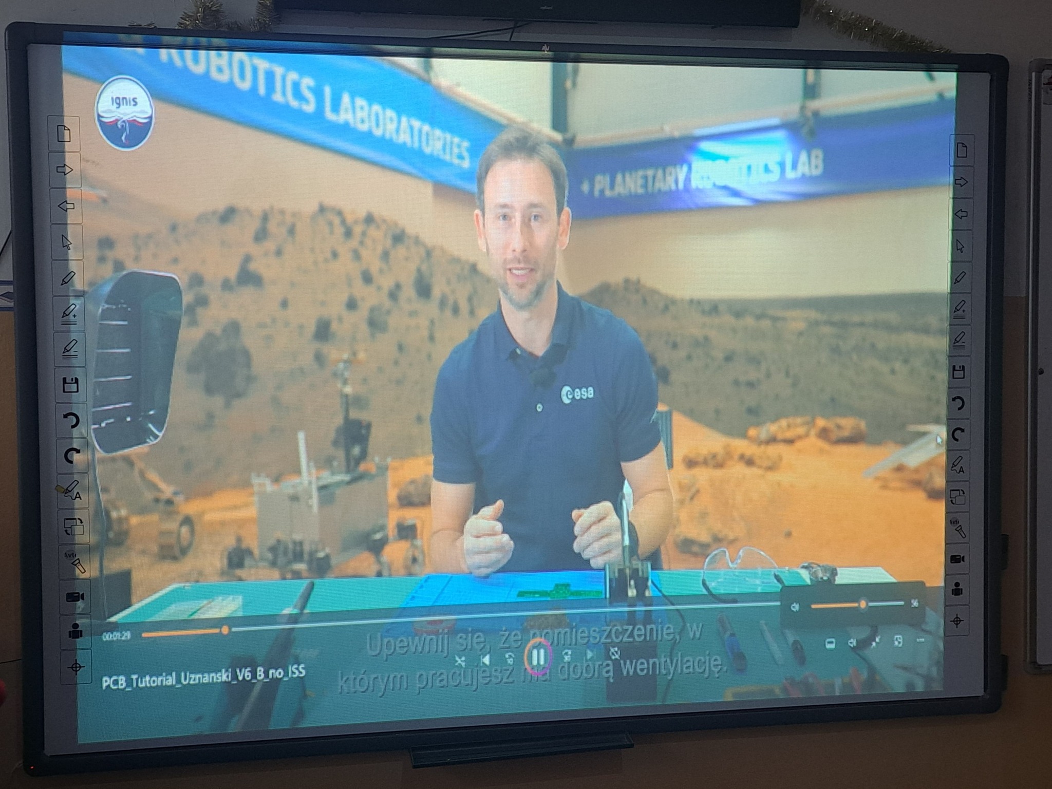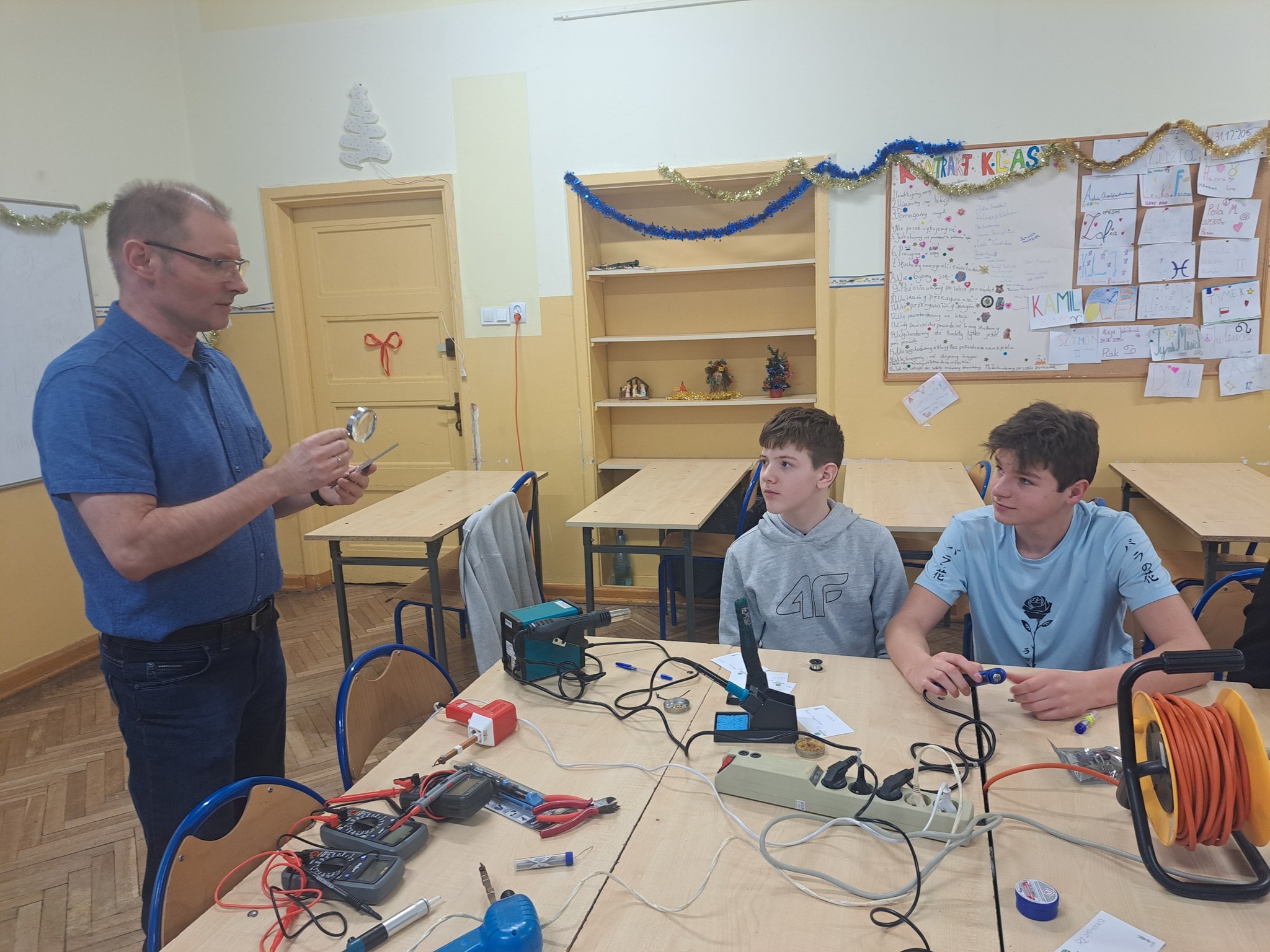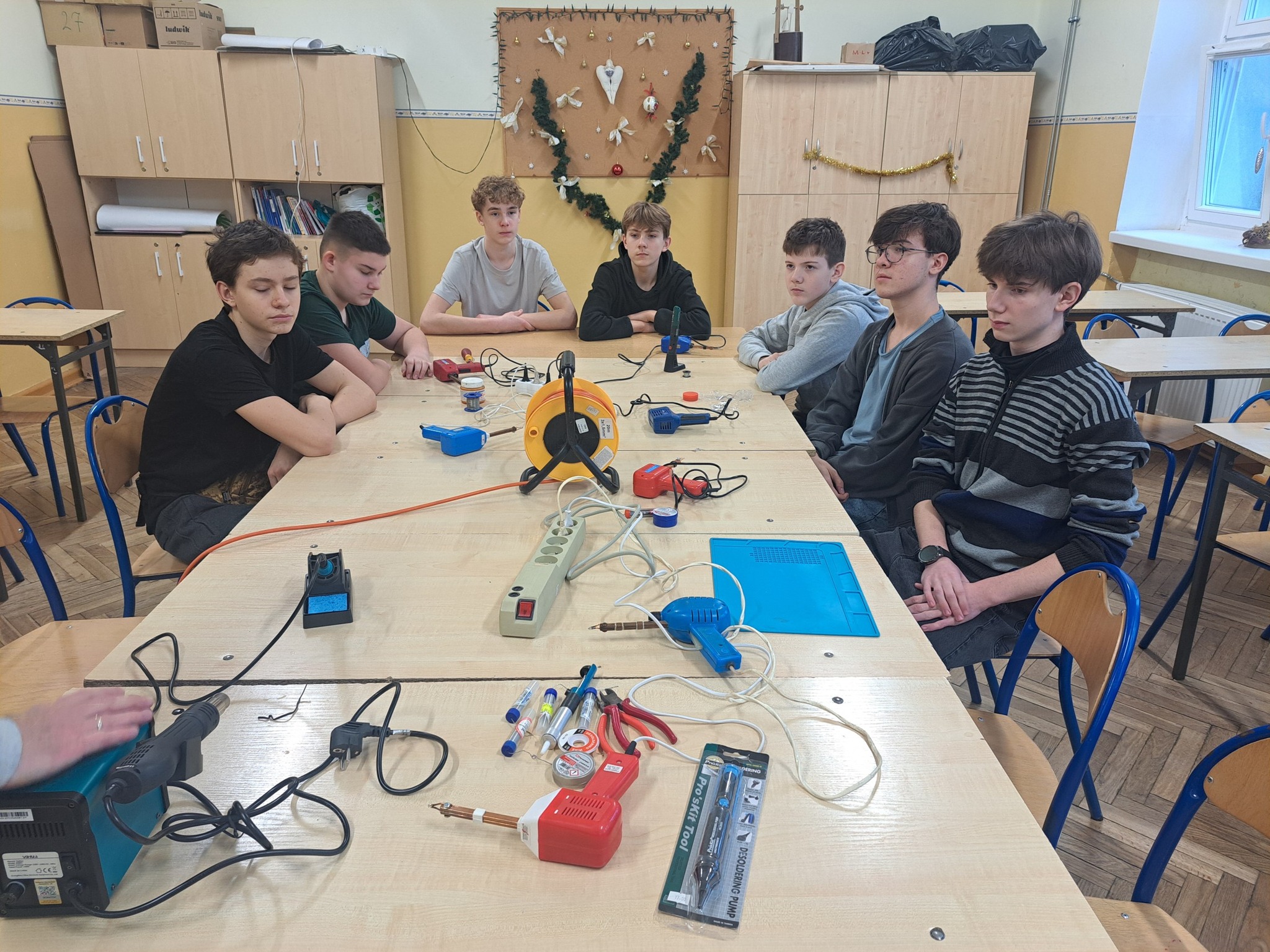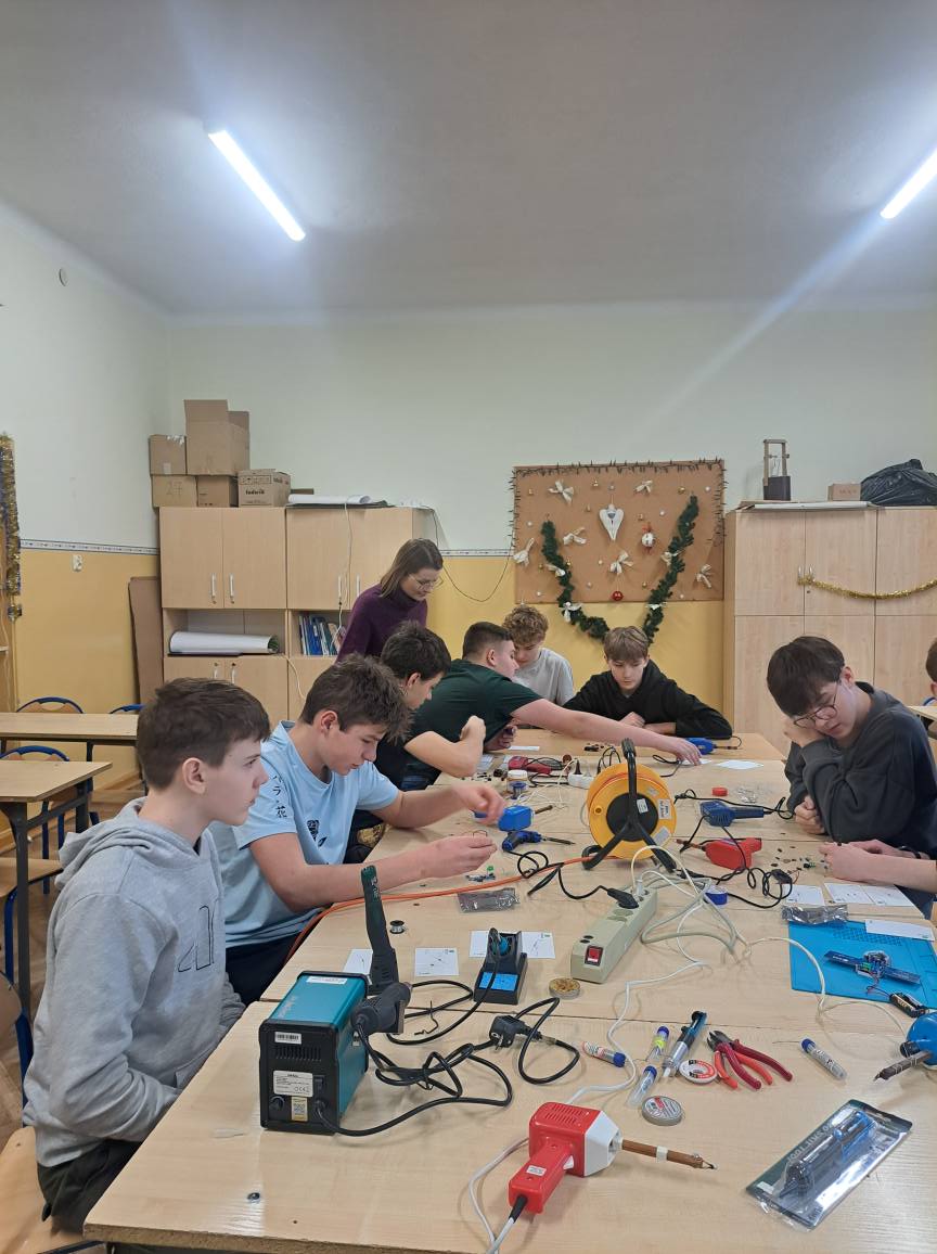 Podczas pierwszych warsztatów, które odbyły się w ramach ogólnopolskiego projektu "Klucz do Kosmosu" ósmoklasiści rozpoznawali i montowali pod kierunkiem p. Brunona Telwikasa i p. Pauliny Zuterek-Makowskiej elementy elektroniczne, sprawdzali za pomocą miernika parametry, a następnie lutowali części z otrzymanych zestawów na płytkę drukowaną w kształcie Międzynarodowej Stacji Kosmicznej. Przed rozpoczęciem zajęć uczniowie obejrzeli instrukcję montażu w formie videotutorialu. Taki sam klucz telegraficzny, jak w zestawach edukacyjnych poleciał wraz z naszym astronautą- Sławoszem Uznańskim-Wiśniewskim na Międzynarodową Stację Kosmiczną!