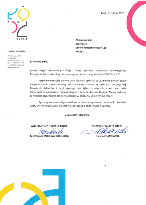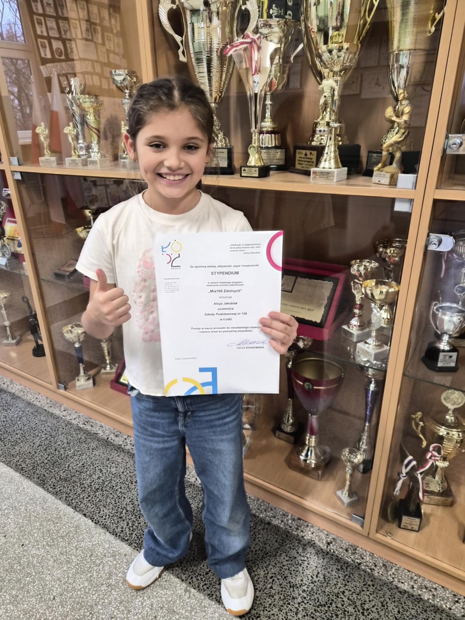 Z dumą i radością informujemy, że uczennica klasy 4b Alicja Jakubiak decyzją Prezydenta Miasta Łodzi została stypendystką w ramach Miejskiego systemu wspierania uczniów uzdolnionych „Mia100 Zdolnych”. Dnia 2 grudnia odebrała nagrodę.